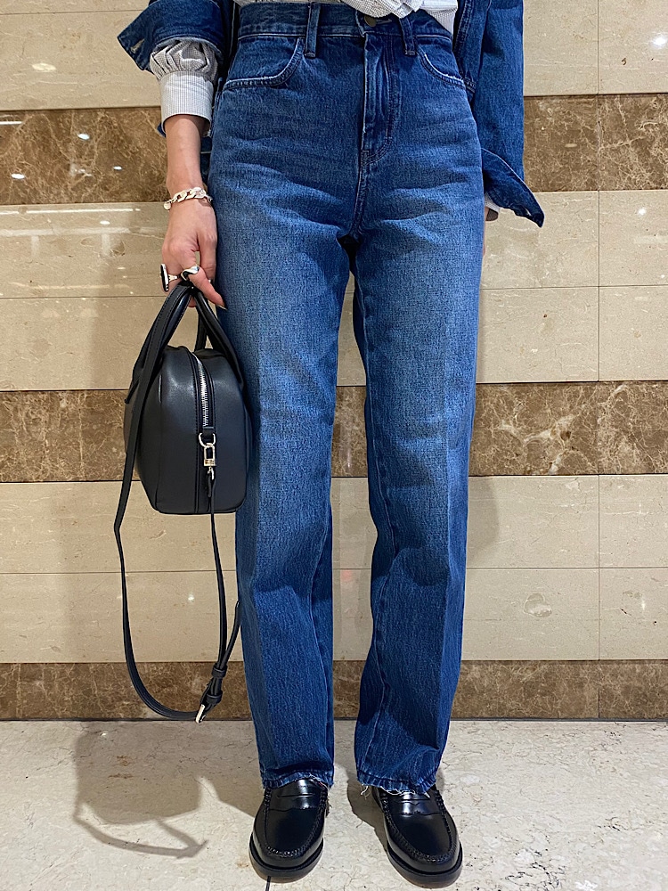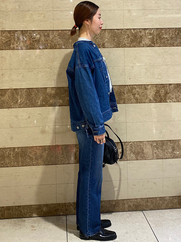 サイズ感:全体的に少し余裕があり、トップスのインをしやすいサイズ感。着丈は靴を履いて裾をすらなに長さ。