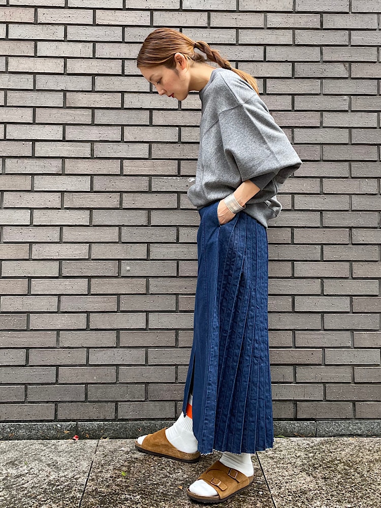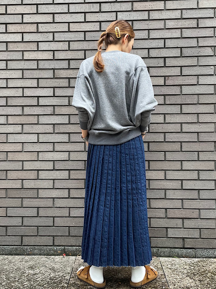 素材感・着心地:柔らかいデニム素材です。厚みもあまりありません。前に開いたスリットやバックのプリーツが女性らしい印象になります。ハイカットのスニーカーやショートブーツなどを合わせても可愛いです
