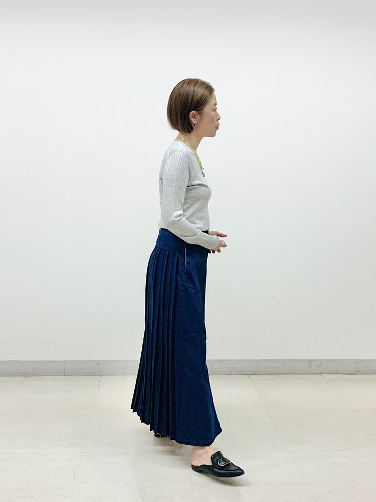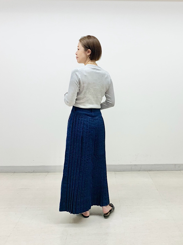 着心地:デニムでプリーツになっており、生地をたっぷり使用したロング丈とは思えないほど軽くやわらかいため、着やすい。