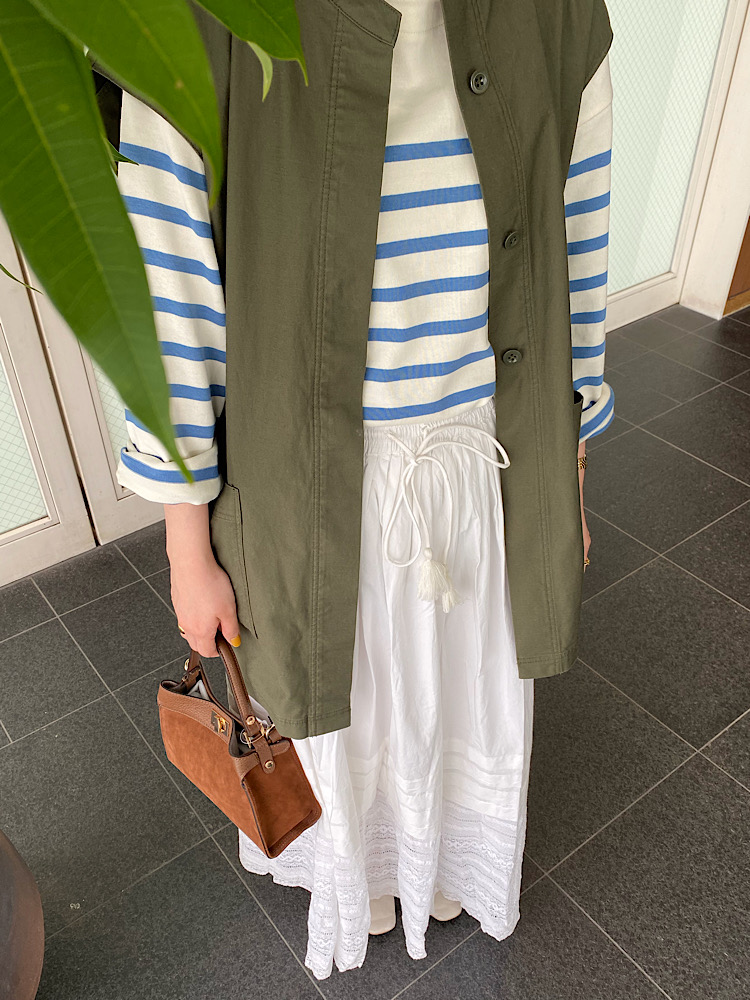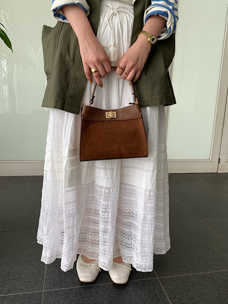白のレーススカートにミリタリー要素を加えることで、甘すぎない雰囲気にまとめました。