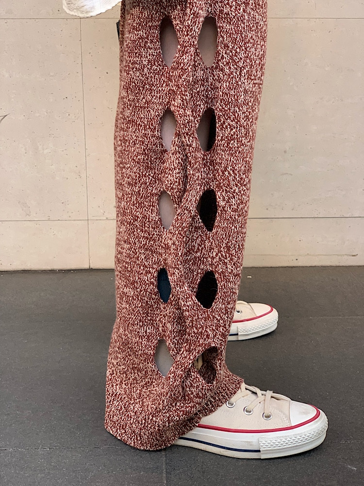 着心地:穴あきデザインですが、ウールを使用しているので真冬も活用出来ます。ハイウエストなのでスタイル効果もあります!