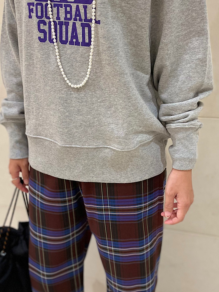 今年のマストアイテム「LOGO 」のトップスを柄の代表格チェックと合わせてみました。