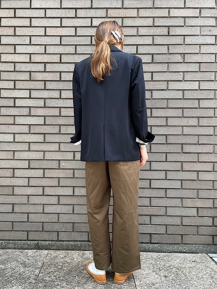 素材感・着心地:ウール素材で袖には裏地が付いています。袖や身頃は比較的余裕があるサイズ感なので、中にパーカーなどを合わせカジュアルなスタイリングも可能です