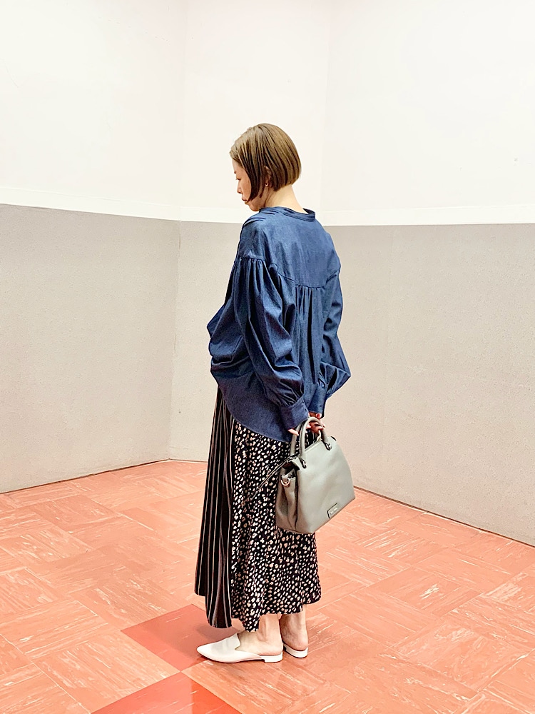 素材感・着心地:薄手の素材なので軽やか。ジョーゼット調のポリエステルとシルクのような光沢感のあるポリエステルのドッキング。