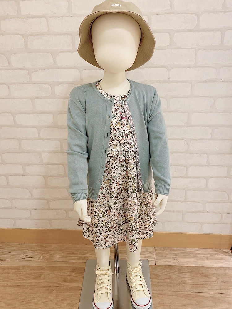 パッと目をひくリバティの花柄ワンピースに、同じくリバティ柄のボタンがアクセントのカーディガンを合わせて女の子らしくまとめました。