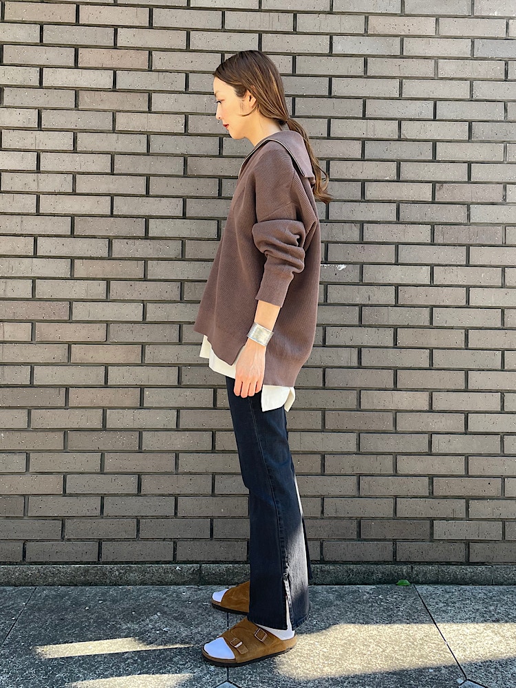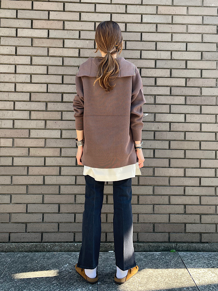 素材感・着心地:やや厚みのあるコットン素材のニットです。着丈がやや短めなので、長めのインナーを重ねました