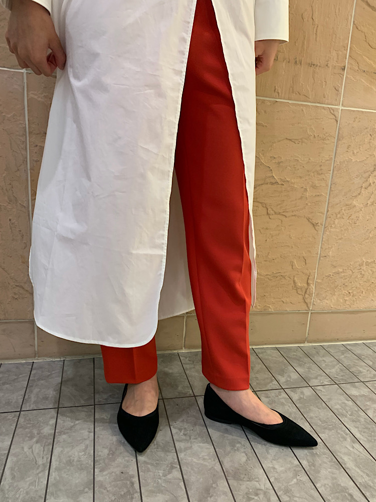 サイズ感:アンクル丈でパンプスと合わせてスッキリ履きこなせます。太もも周りに程よくゆとりがあり、履きやすい。