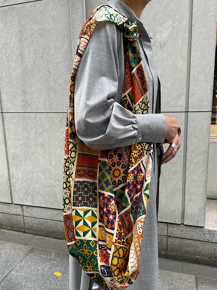 【素材感・着心地】張り感ある前開きワンピース。羽織でも使用可能。着脱出来る襟とリボンベルト付き。108×108大判シルクスカーフ。レザーの紐付き。バッグのように使っても。首に腰に巻いてもと使い方は自由!