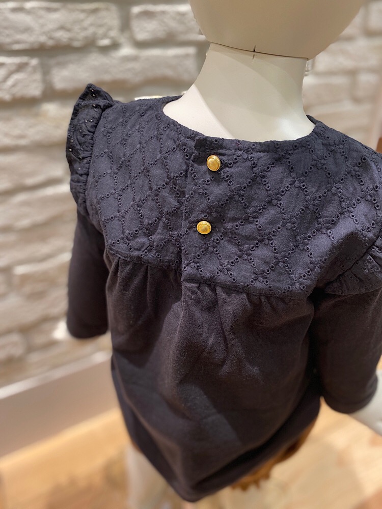 黒にキャメルの組み合わせで、秋らしくコーディネートしています。 カットソー素材でとても着やすくておススメです。 ブラウスのようにも見えるので、お出かけにも着て頂けます。 背中のゴールドボタンもポイントです。