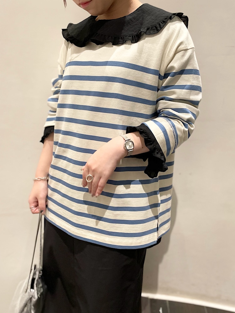 商品紹介:1枚で着ても中にレイヤードしても可愛い1枚です。フリルの部分が甘すぎないデザインなのでカジュアルな服とも相性がいいです。