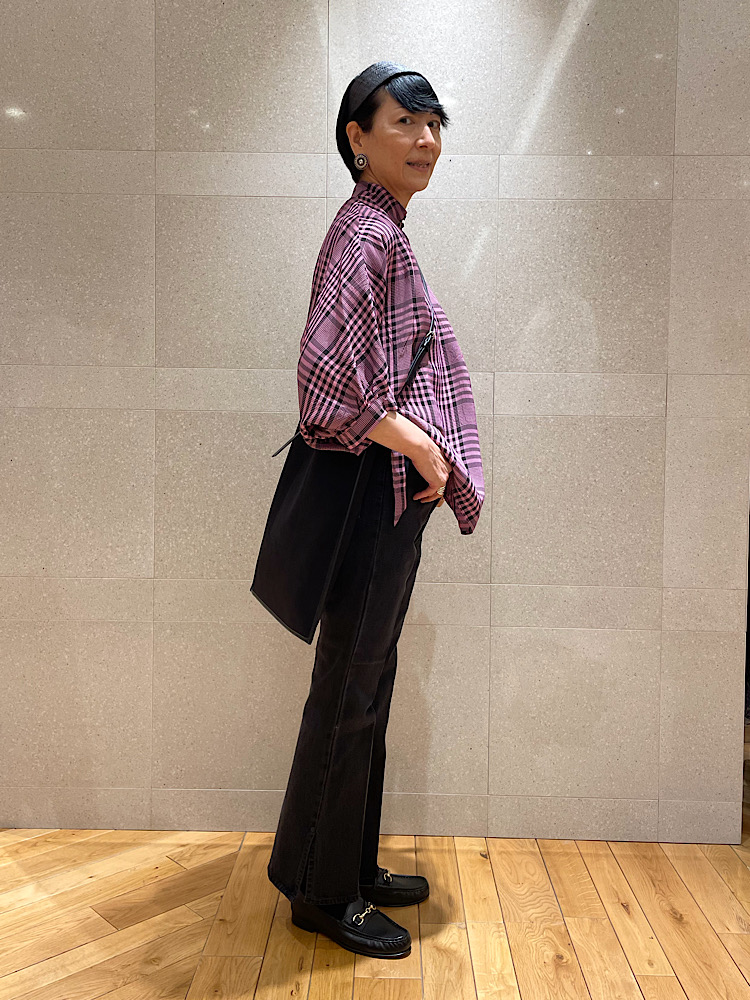 着用アイテム: ピンクチェックブラウス:ブラックデニム