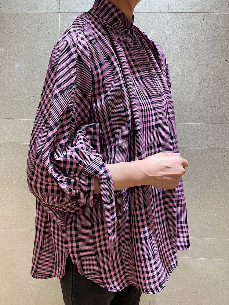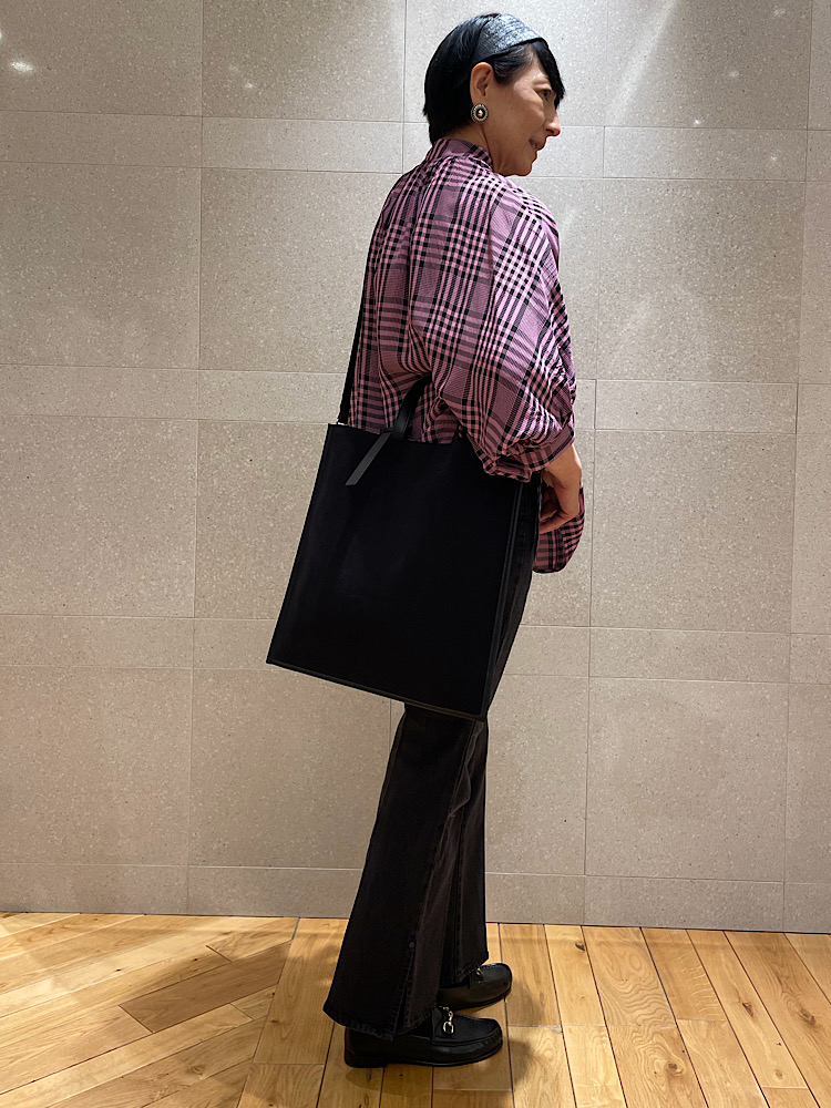 【素材感・着心地】Viscose100%。サラッとした肌触り。大人も抵抗無く着用出来るローズピンクチェックブラウス。ブラックデニムとローファーでトラッドスタイリング。