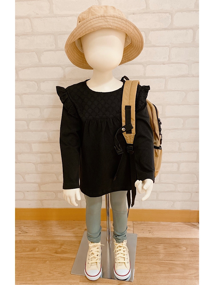 シンプルだけどさりげなく胸元にレースが施してあるロングTシャツは、年間通して大活躍します!カラーパンツと合わせて子供らしさもプラスしてみました。