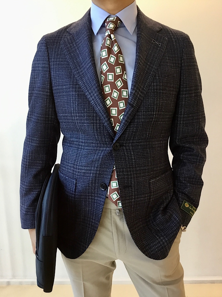 ネクタイのブラウンで秋らしさを取り入れたネイビージャケットのコーディネート。