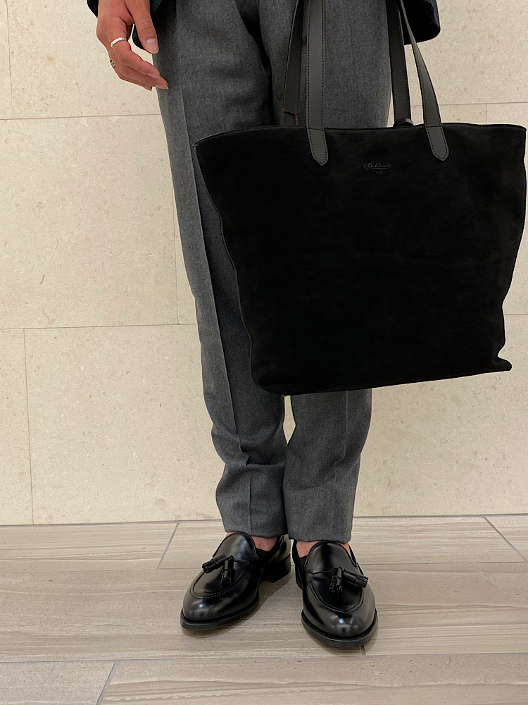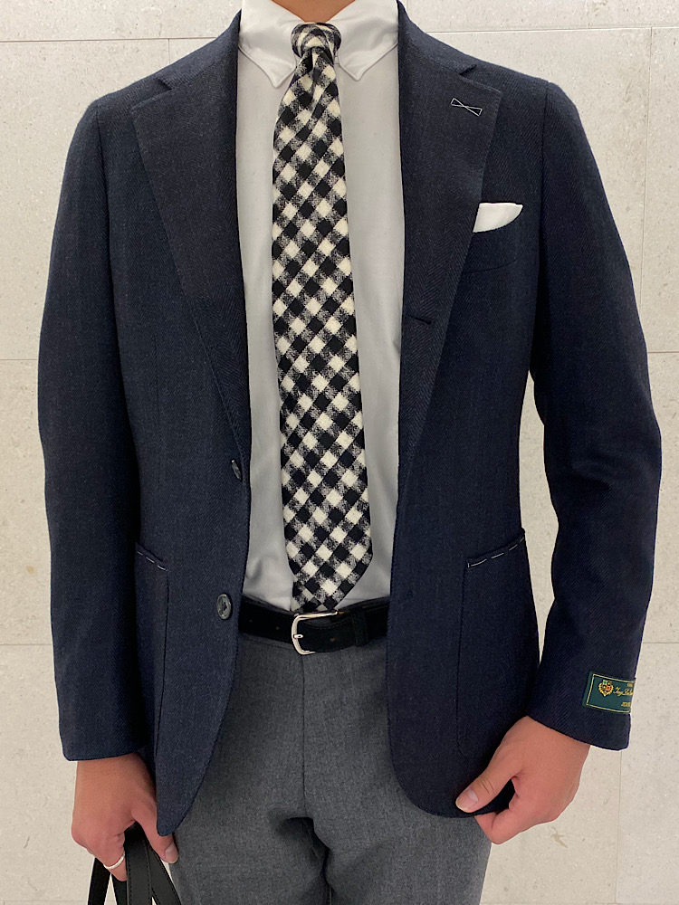 ネイビーとグレーの組み合わせにチェックのタイで遊び心を。