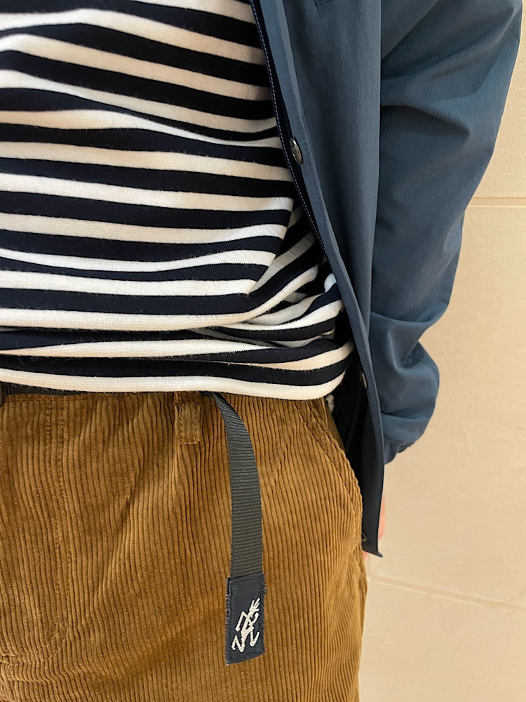 ウエストにベルトがついているので調整できる。コーデュロイの質感が良い。