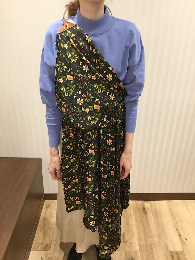 ブルーのニットにスカーフがポイントの、エレガントコーディネート!