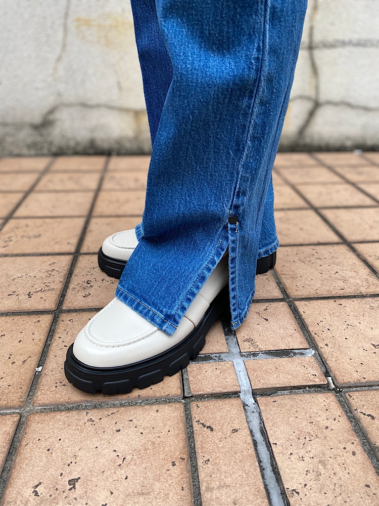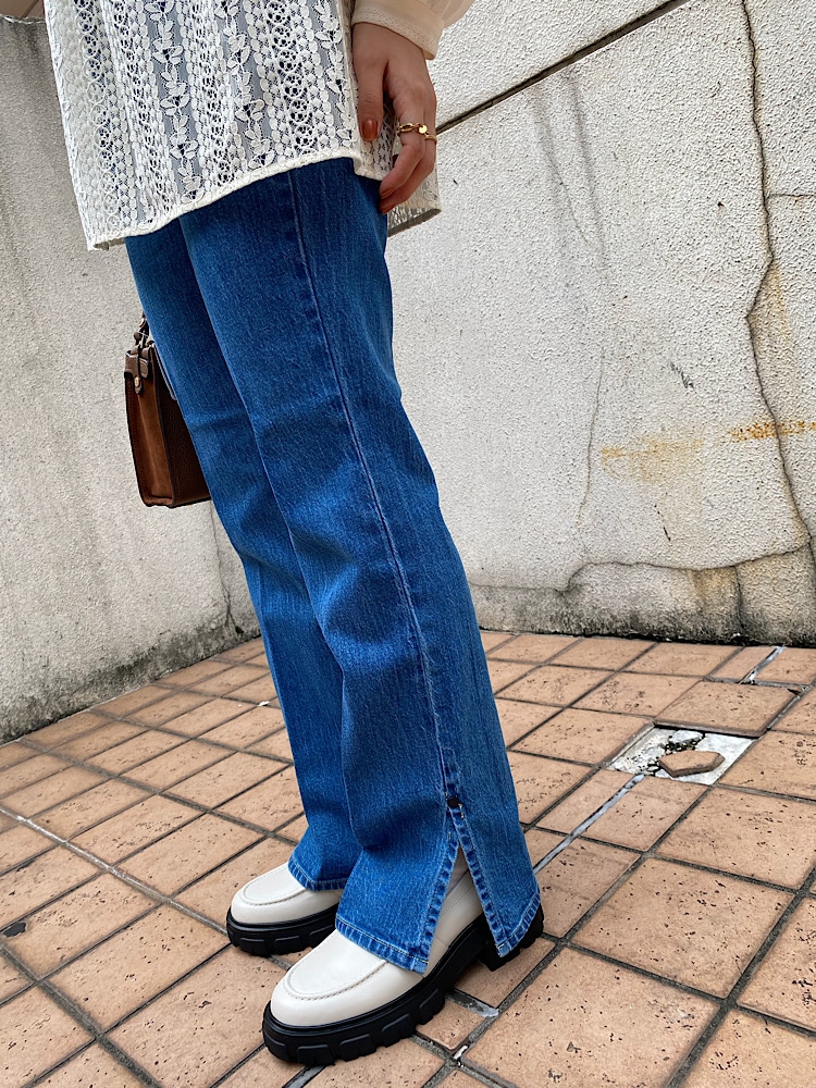 サイズ感:ハイウエストで太もも周りすっきり、裾はフレアです