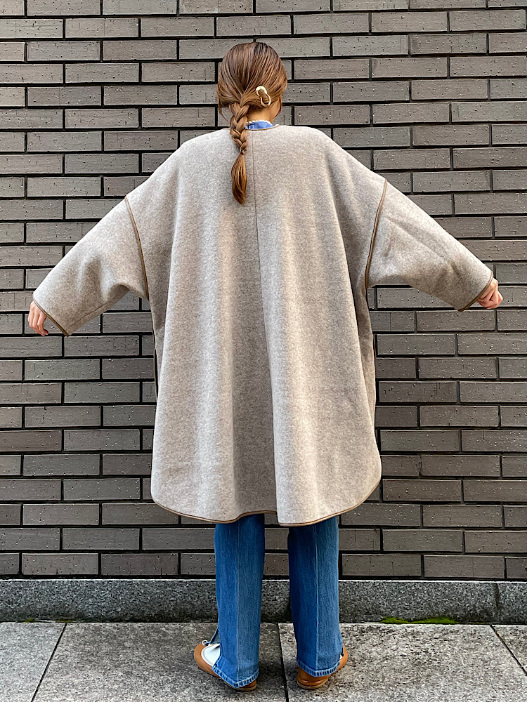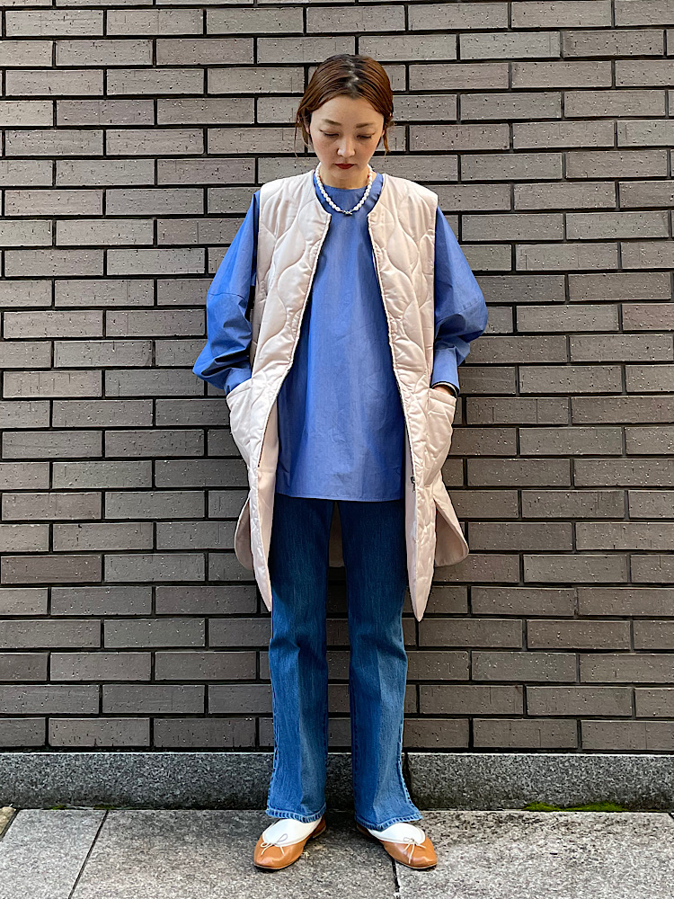 素材感・着心地:ウール素材のアウターに中綿のキルティングベストがセットになっています。アウターはオーバーサイズで軽く、また季節によってはベストのみでの着用も可能です