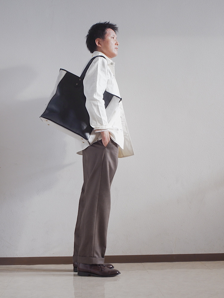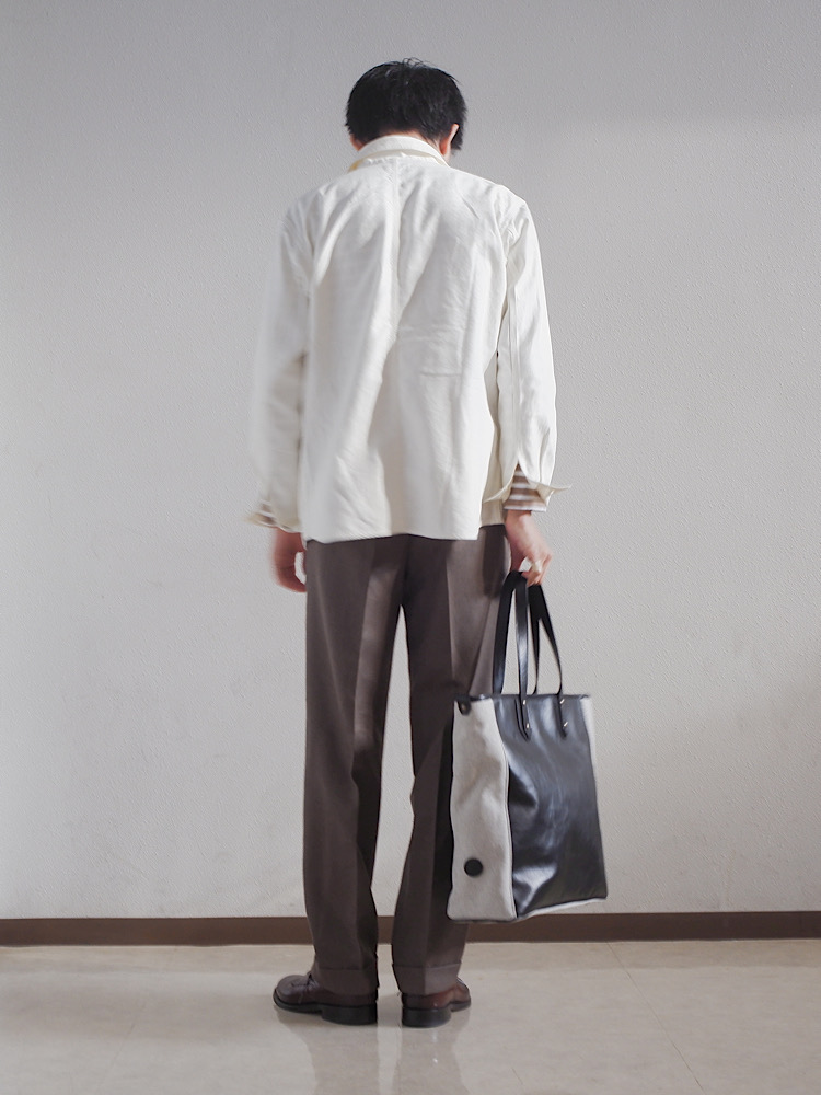 身幅はやや細身。ミリタリーベースのシャツ羽織。