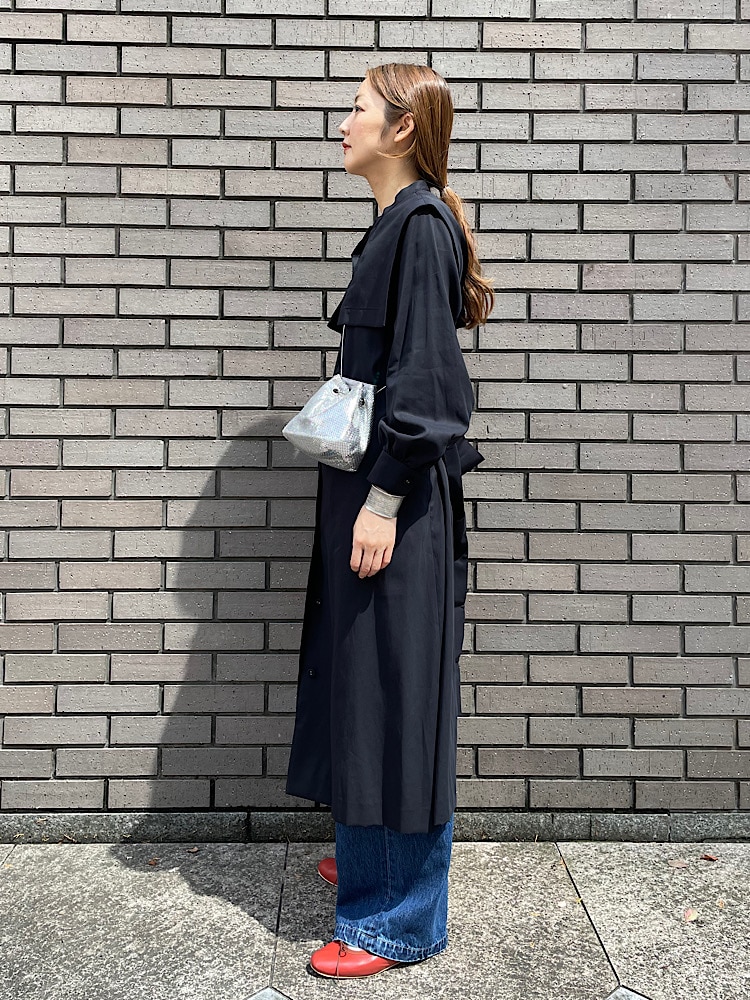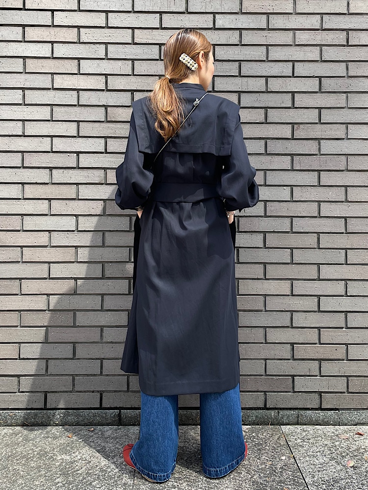 素材感・着心地:コットン素材ですが、少し光沢のある生地感です。ウエストには太めのベルトが付いておりウエストマークしたり、また前ボタンを外して羽織りとしても着用して頂けます