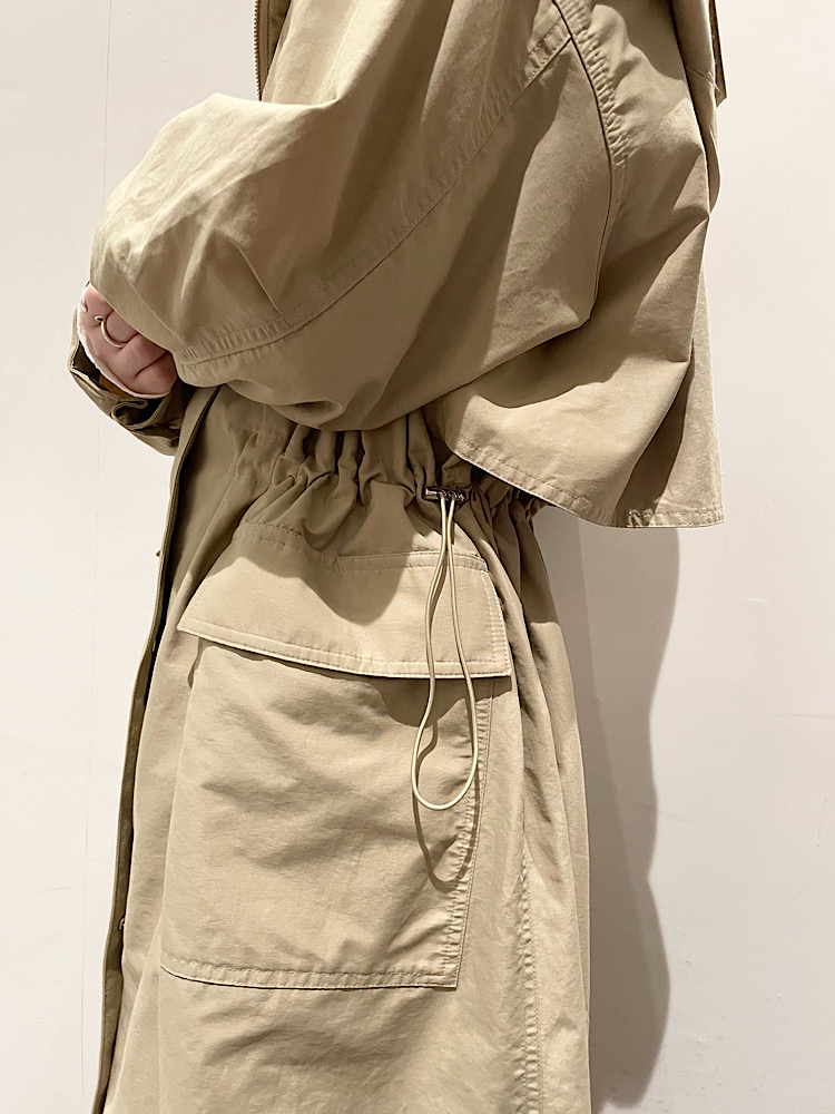 商品紹介:素材自体が薄めなので秋から春位まで羽織れて、シーズン長く着ていただけます。ウエスト部分の絞りを絞って頂くと、腰位置が高く見えまた雰囲気を変えて着ていただけます。