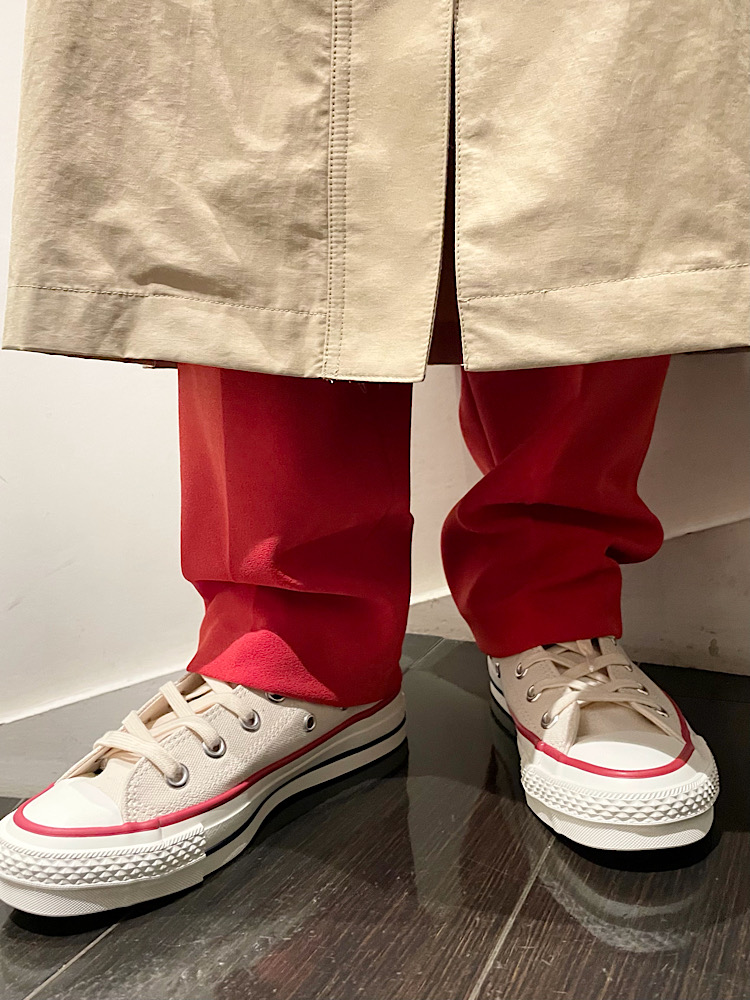 商品紹介:ハイウエストになっている為腰位置が高くみえ脚が綺麗に見えるシルエットでした。また太すぎないシルエットだった為、小柄な方でも大きく見えすぎず履いていただけます。