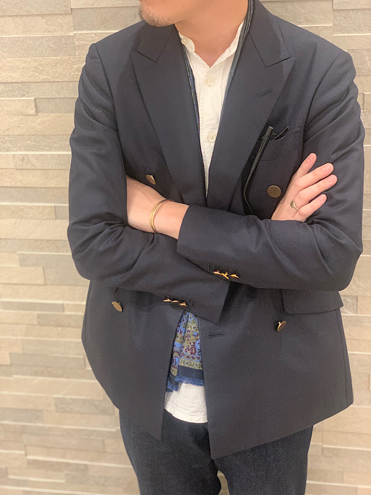 定番のネイビーブレザーもパンツのシルエットを変えるだけで新鮮に映ります。