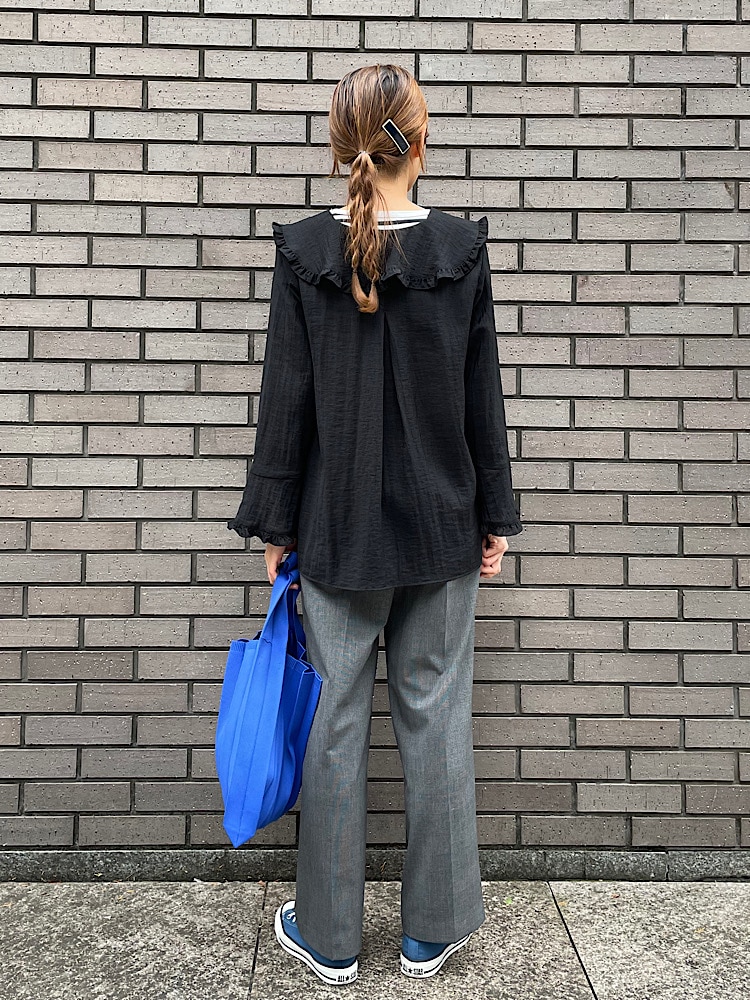素材感・着心地:レーヨン/ナイロンのさらりとした素材感。光沢は無いので、フリルの襟ですが甘くなりすぎません。スウェットなどのインナーとして、襟を出しても可愛いです