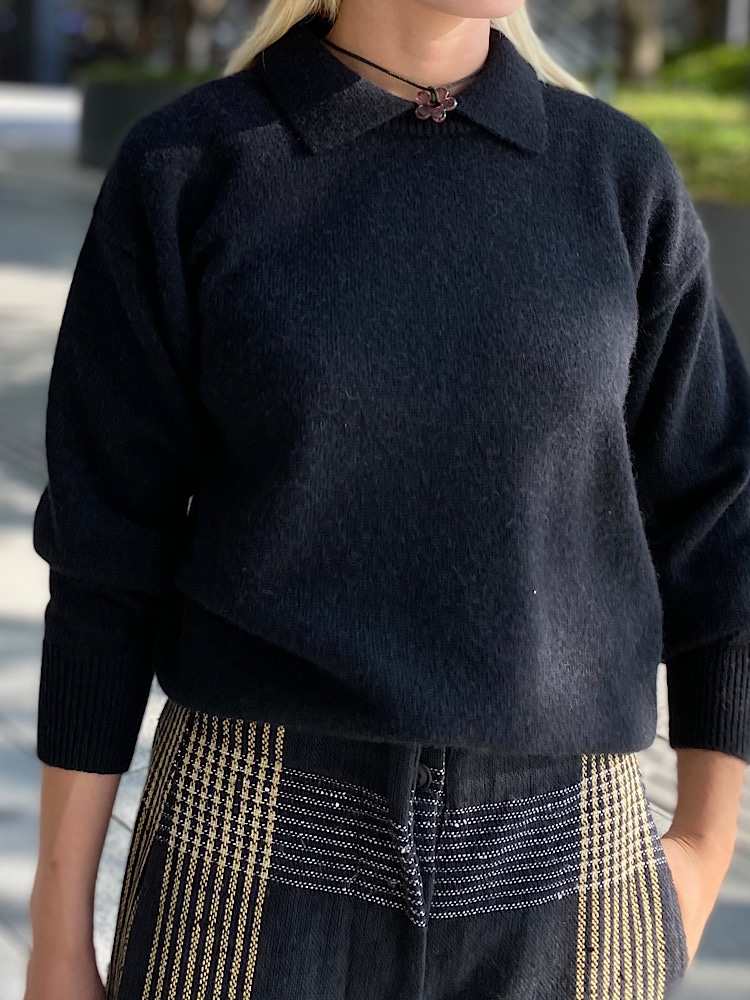 着こなしポイント: 襟付きですが、ブラックなので落ち着いた印象で着て頂けます