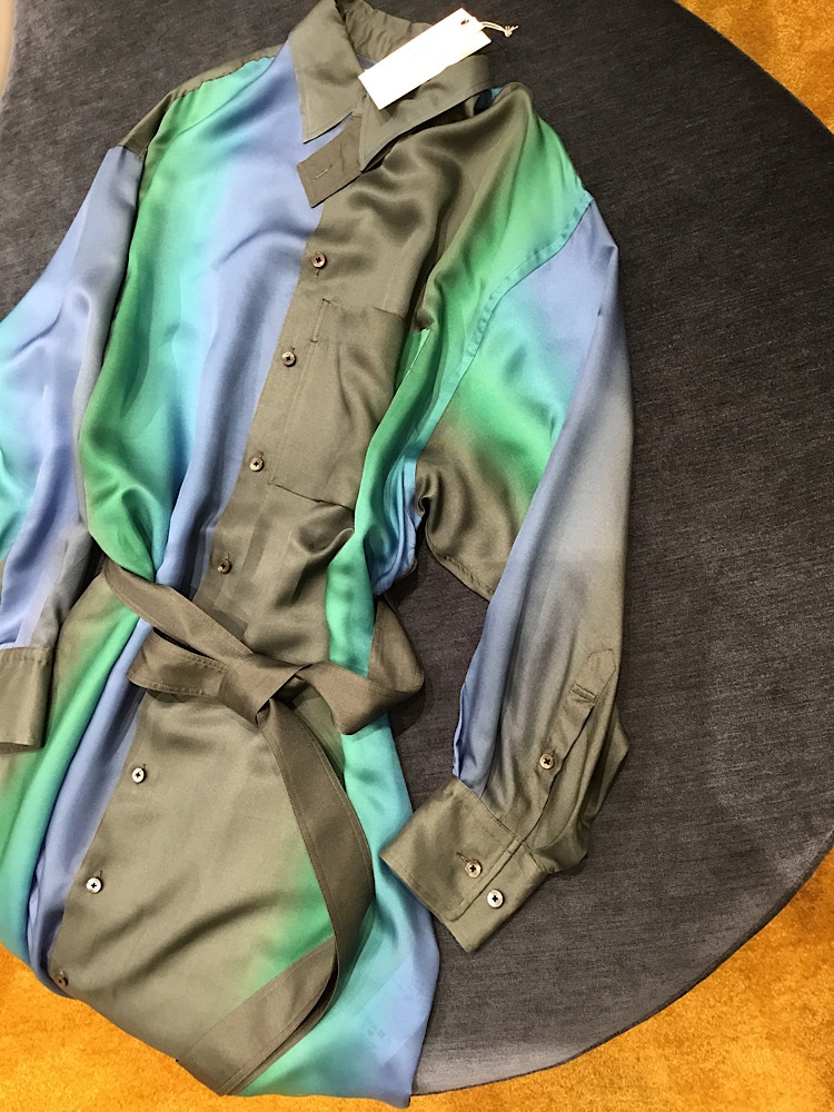 【素材感・着心地】グリーン、ブルー、カーキで構成されたグラデーションが印象的な一枚。