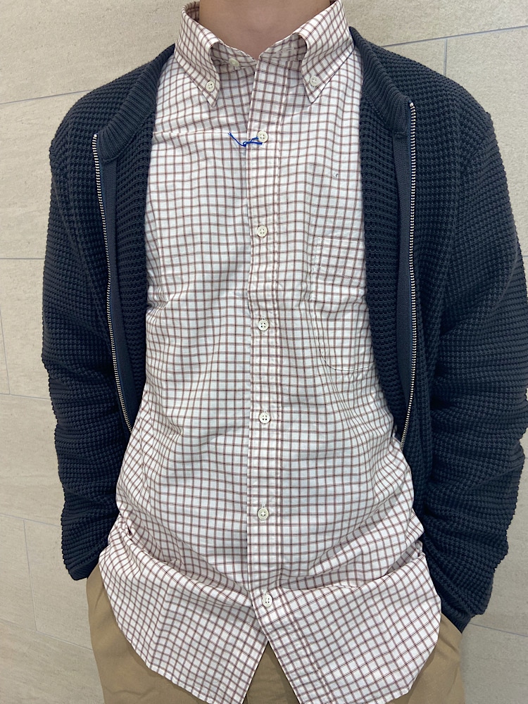 【素材感・着心地】伝統的な先染織物「播州織」で仕上げたボタンダウンシャツ。ハリコシのある素材感。タックインしてもボタンを開けて羽織りとしても活躍する商品。