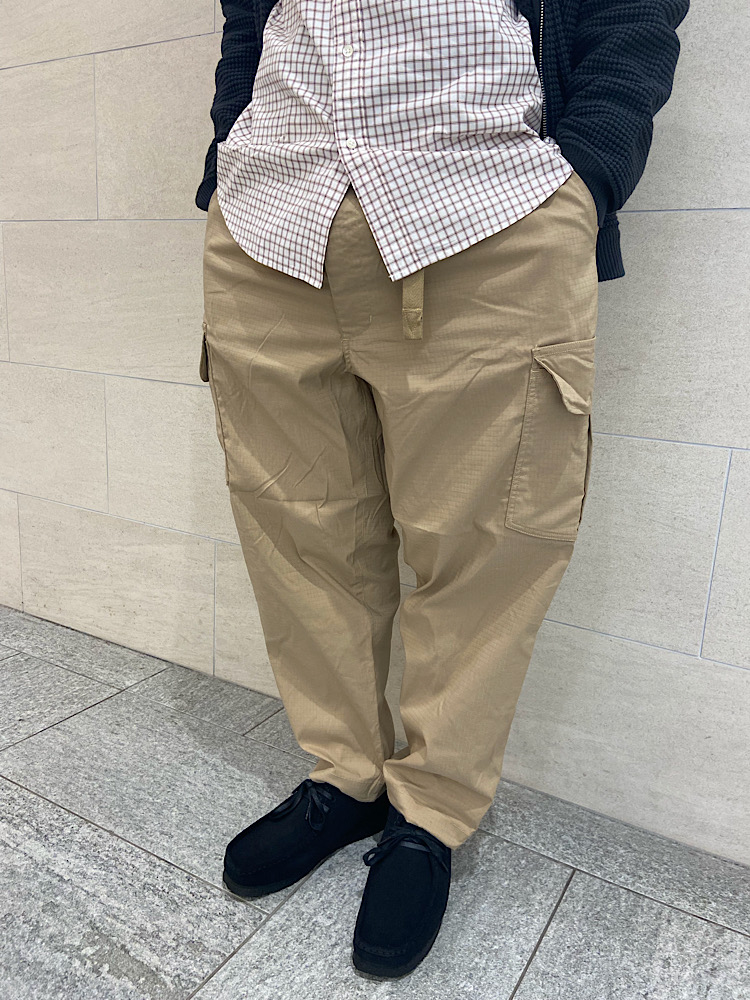 【素材感・着心地】コットンとポリエステルで出来た、全シーズン対応のカーゴパンツ。ウエストはバックルベルト付きのイージー仕様、裾はシルエットの変化を楽しめるドローコード仕様になっている。