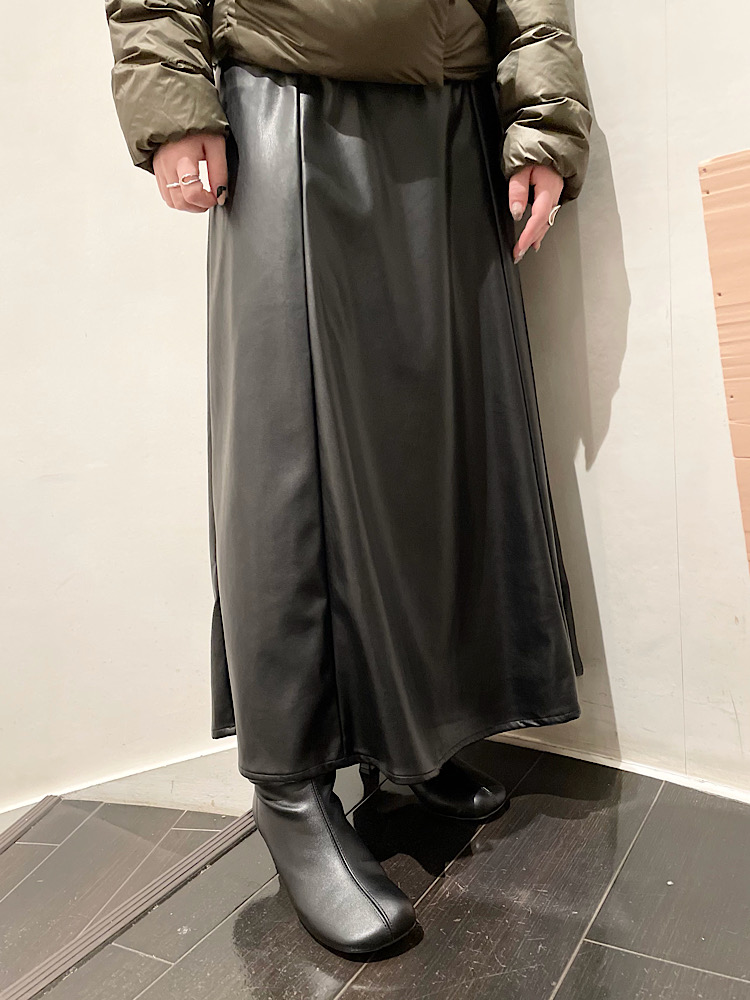 キレイめなトップスとも合わせて着ていただけます。フレアの形も綺麗で広がりすぎないので バランスよく着ていただけます。また素材がフェイクレザーなのでお家でお手洗いしていただけるのでお手入れも簡単です。
