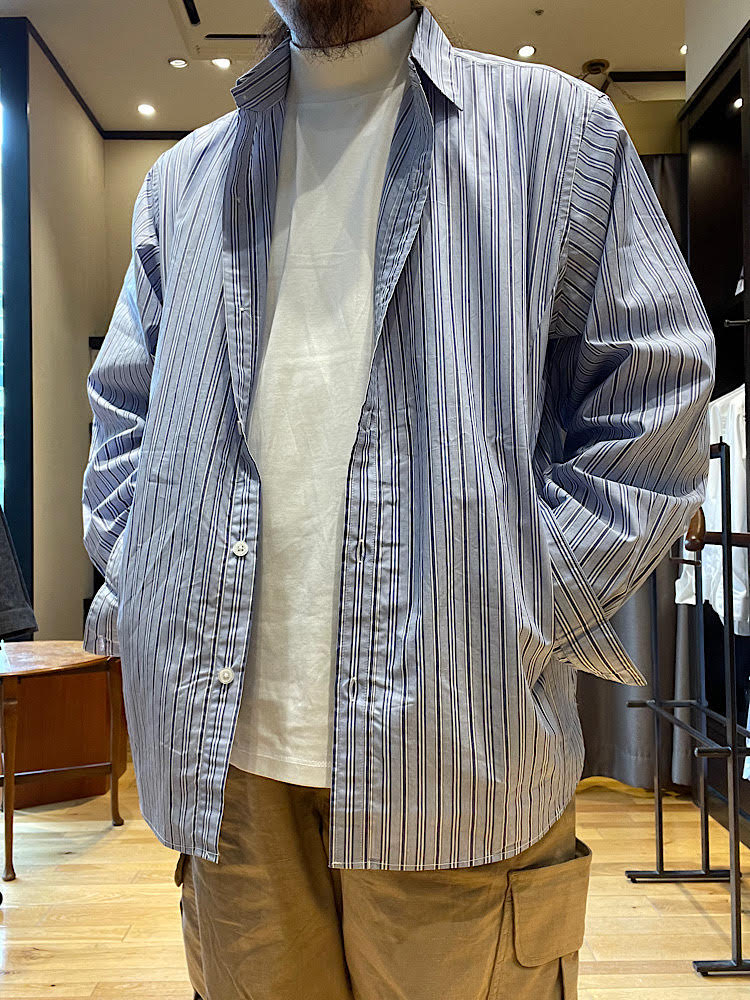素材感・着心地:膨らみがあるシルエットが特徴。ドレスシャツの様な滑らかな生地で大人の上品さを感じさせる1枚。