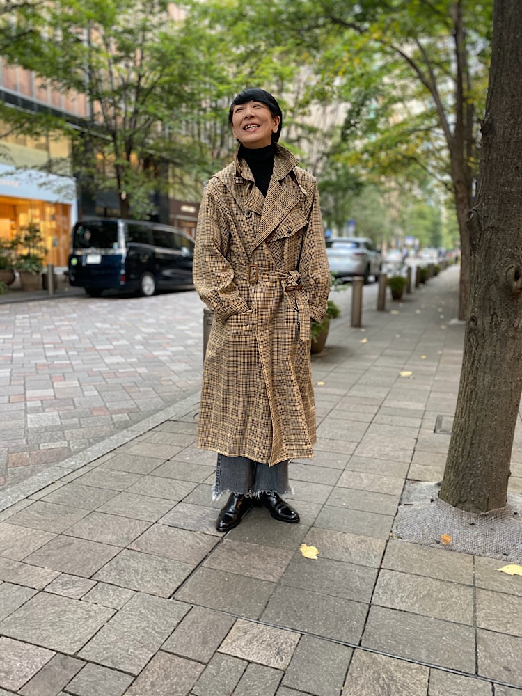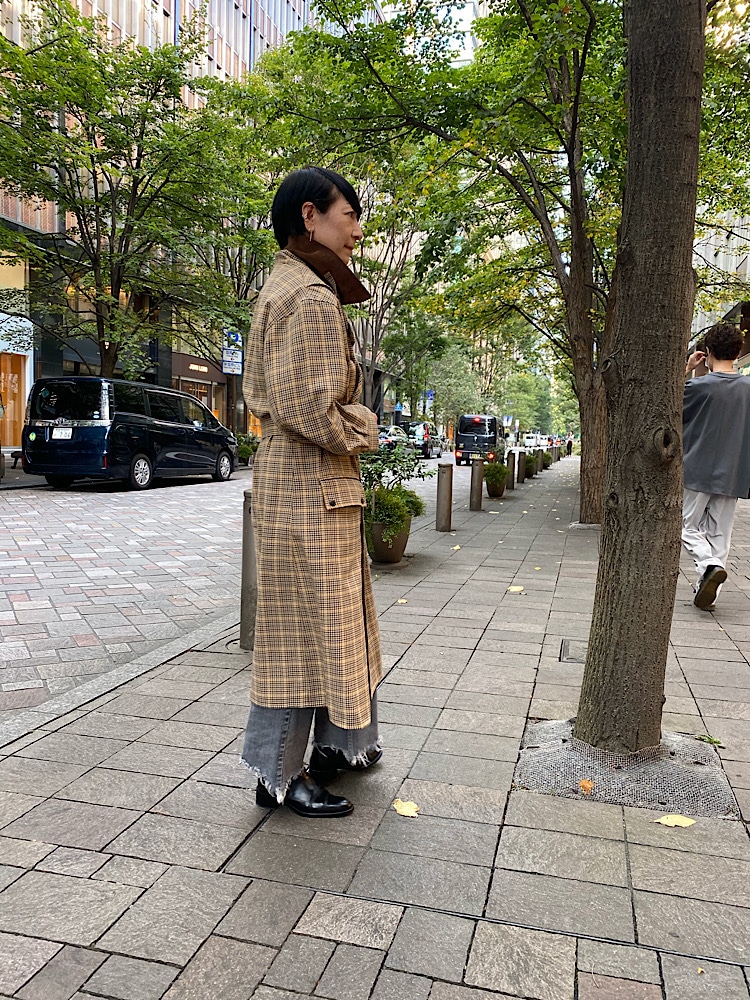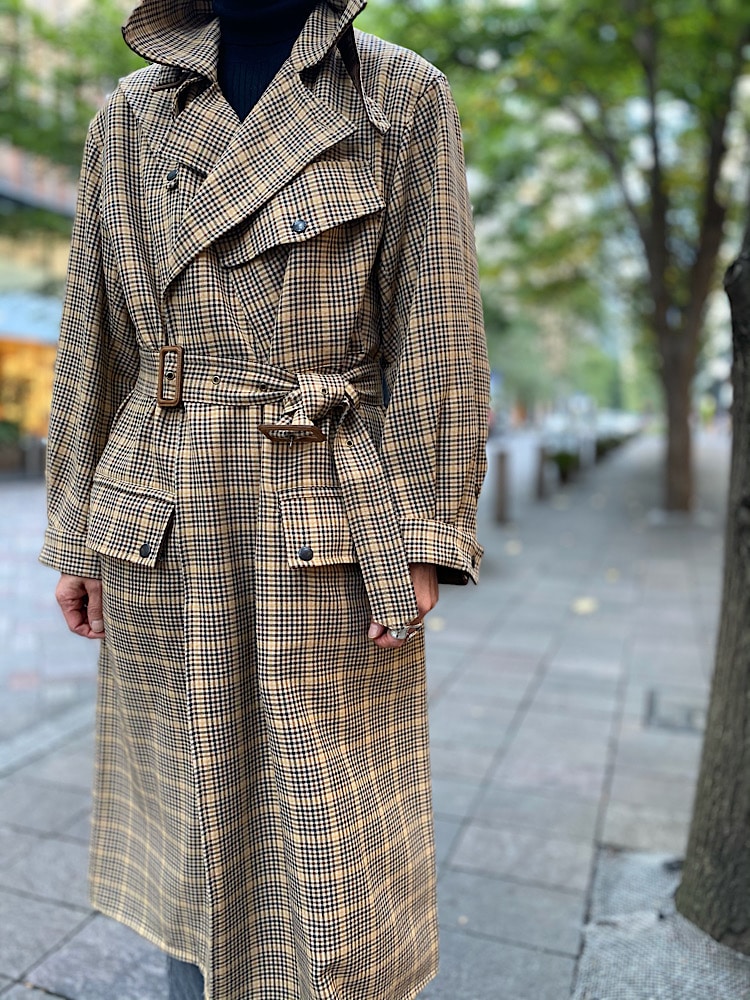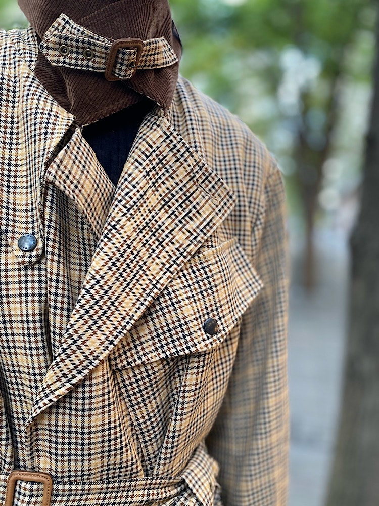 【素材感・着心地】ポリエステル95%レーヨン5%。圧倒的に軽い素材。ガンクラブチェックの大人のロングコート(着丈118p)。襟と袖口裏にコーデュロイを使用。襟を立たせたり袖口を折り返したりと着こなしを自由に。