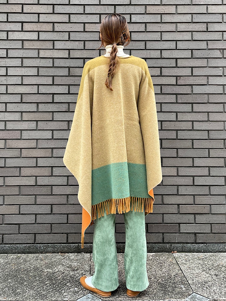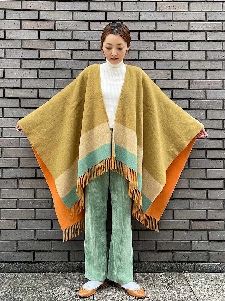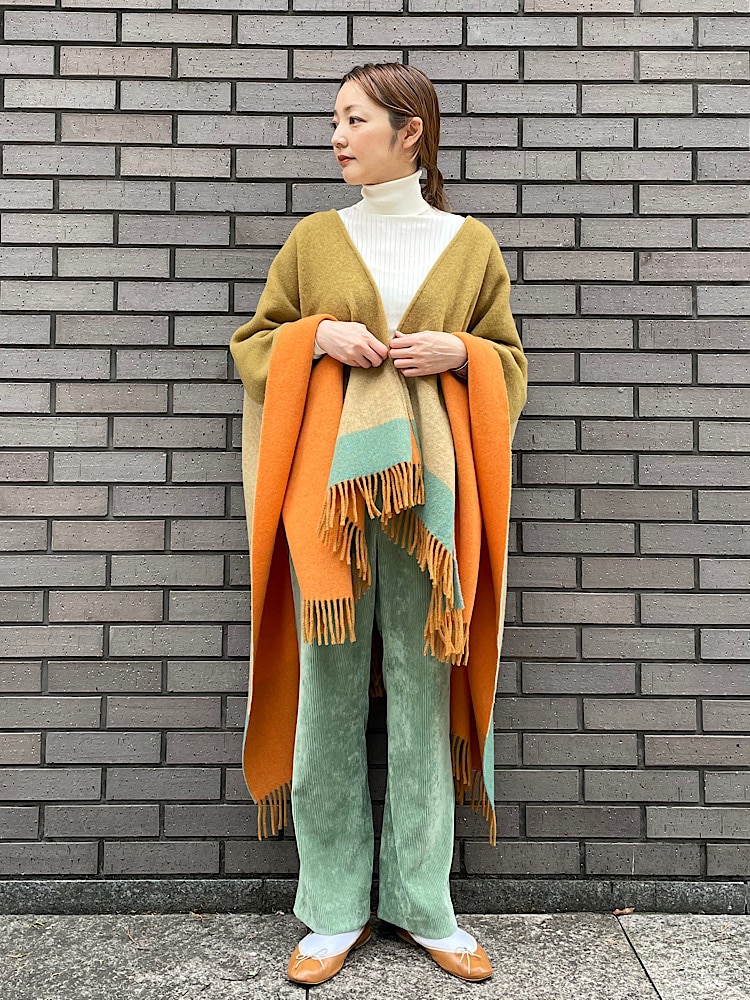素材感・着心地:ウール/ナイロンの厚みのある素材です。見た目より軽いので、カーディガン変わりに着用する事は勿論、コートの上から着用しても色がポイントになり可愛いです