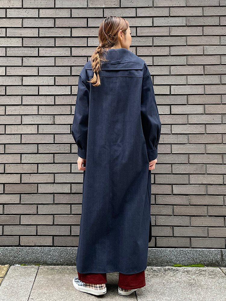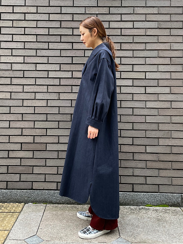 素材感・着心地:少しハリ感のあるデニム素材です。肩周り、袖はボリュームがある為、タートルネックのニットなどの重ね着ができます。透け感は無いので、一枚でブーツ合わせもおススメです