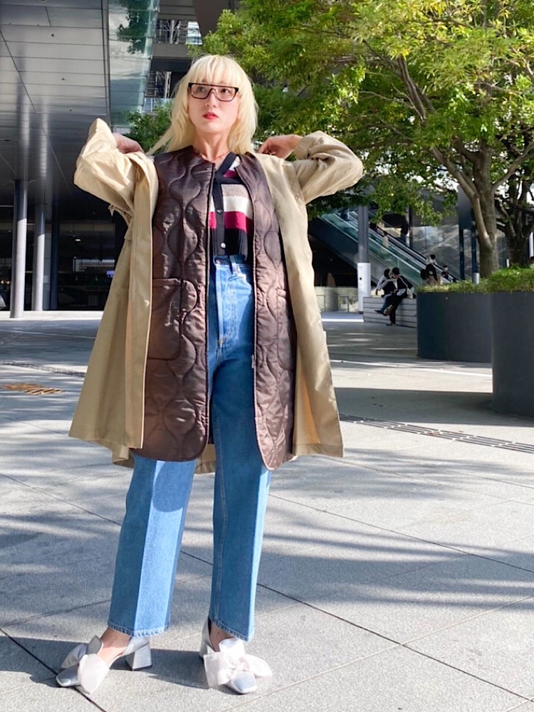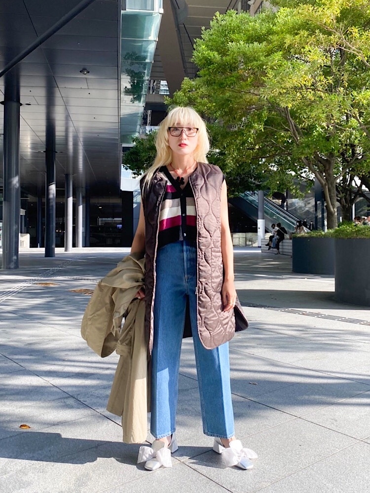 着こなしポイント: ハイウエストなので、トップスはインか短めのものがおすすめです
