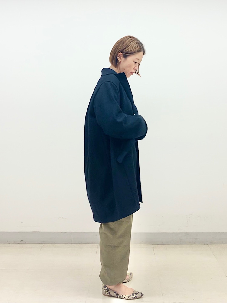 【素材感・着心地】しっかりとした素材。やや重量感はあるが、着るとゆとりがあるため、重くは感じない。ボタンレスで、フロントは自然に開き、着こなしに幅が出る。