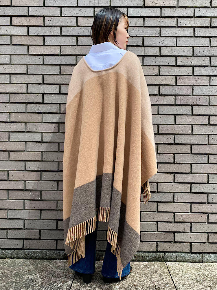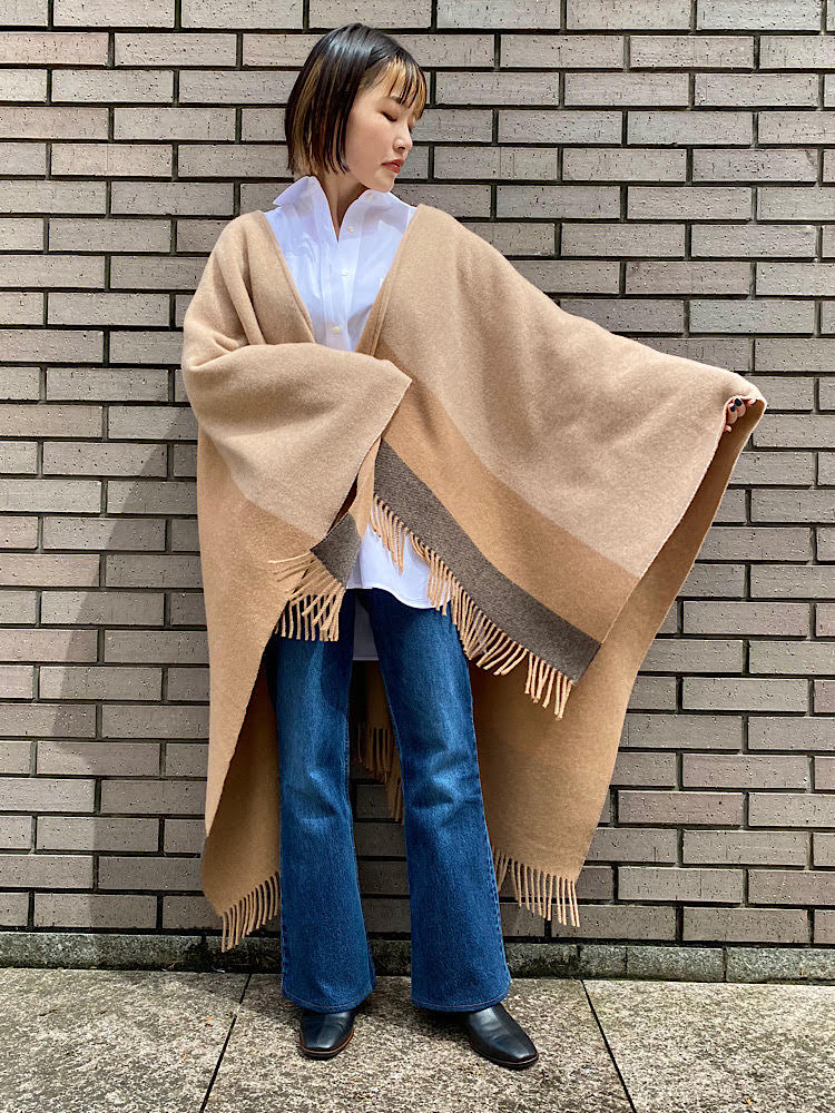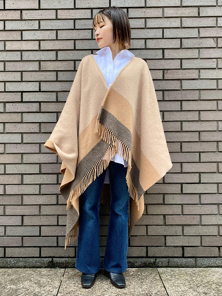 ハリ感のあるシャツにポンチョとデニムを合わせた、