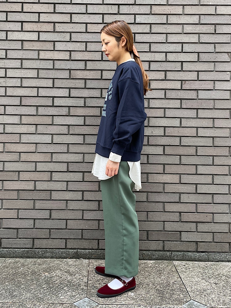 素材感・着心地:コットン素材でスウェットとしては比較的薄手です。詰まりすぎていない首元からは、襟やインナーを見せても可愛いです