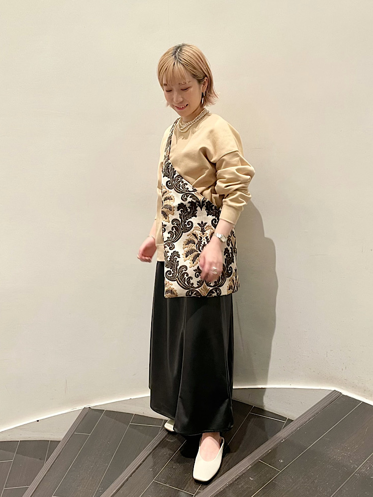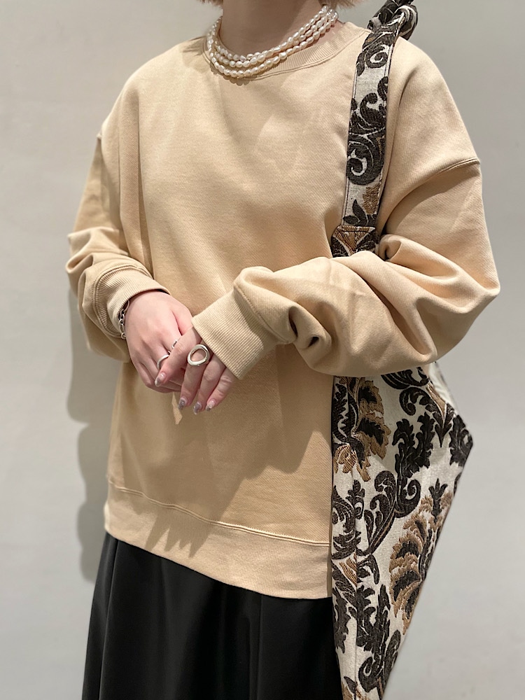 商品紹介:生地に光沢感がある為カジュアルになりすぎずキレイめなボトムとも相性がいいです。首元も合わせやすいクルーネックとなっております。