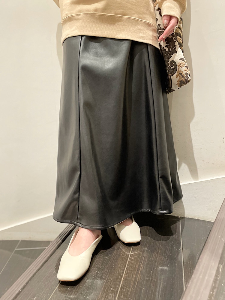 商品紹介:ウエストがゴムなので楽に履いていただけます。フェイクレザーの為お家でお手洗いが可能なのでお手入れがしやすいです。フレアな形も広がりすぎない為バランスよく履けました。