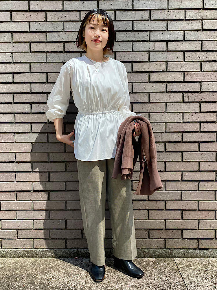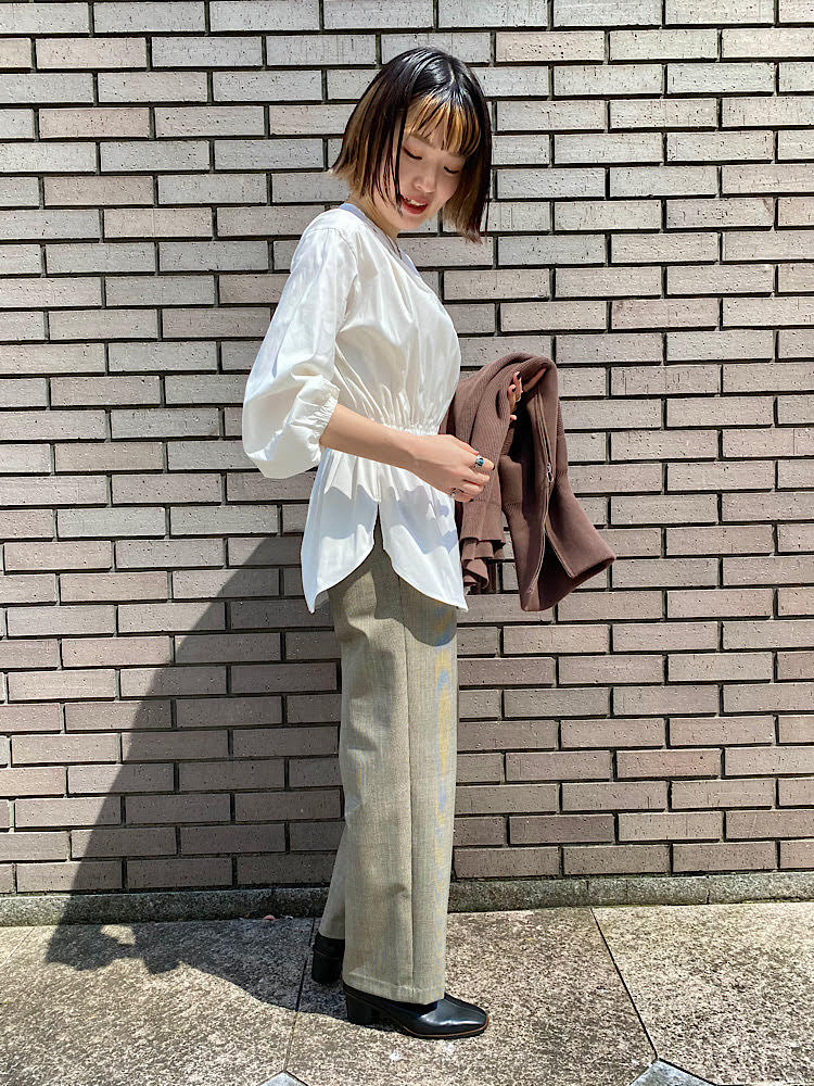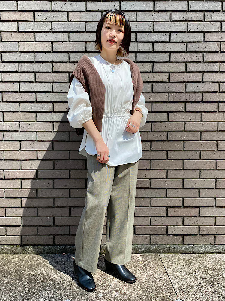 ハリ感のあるブラウスに肩から肉厚ニットをかけ、