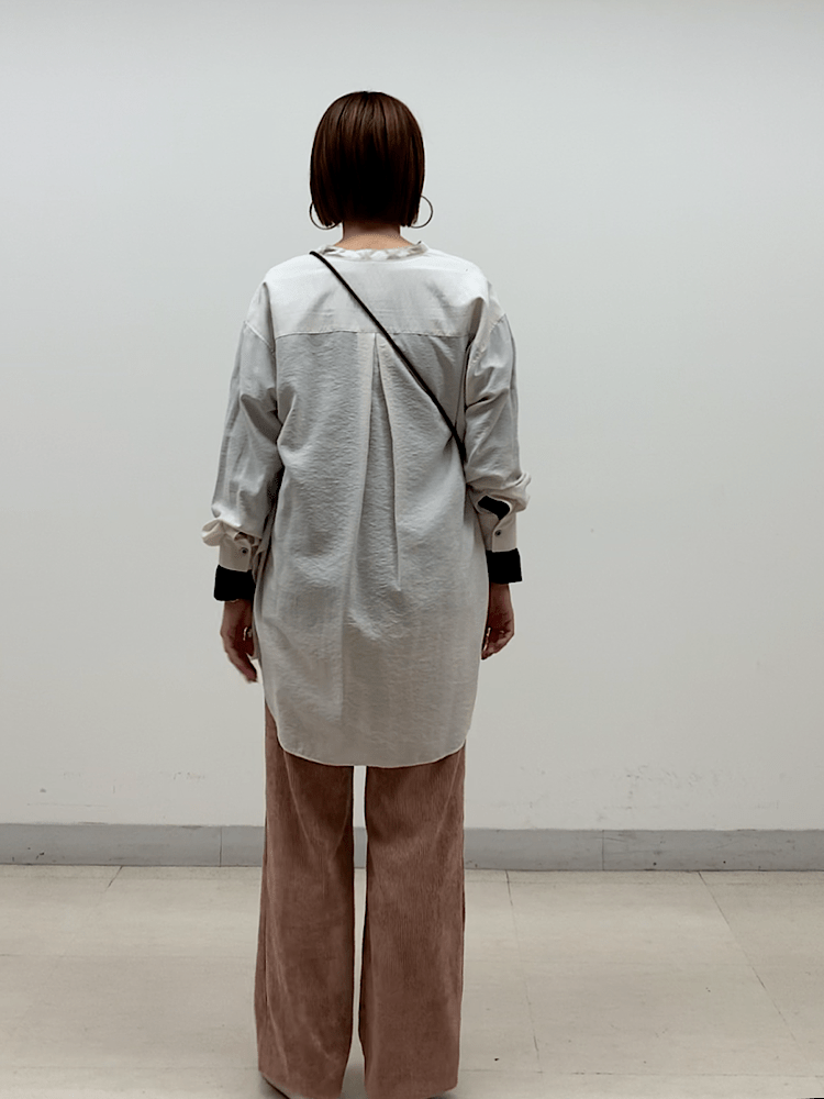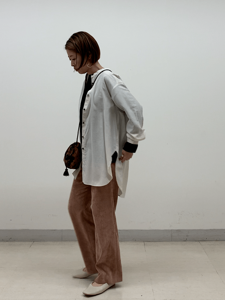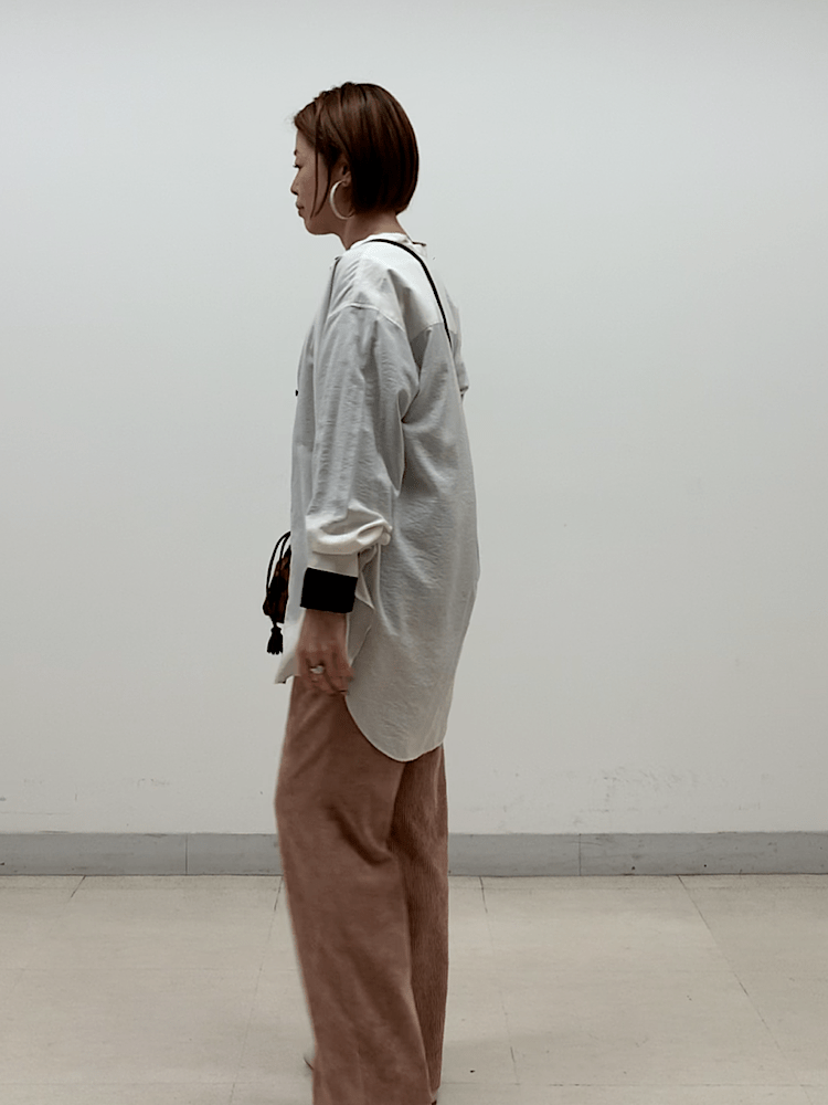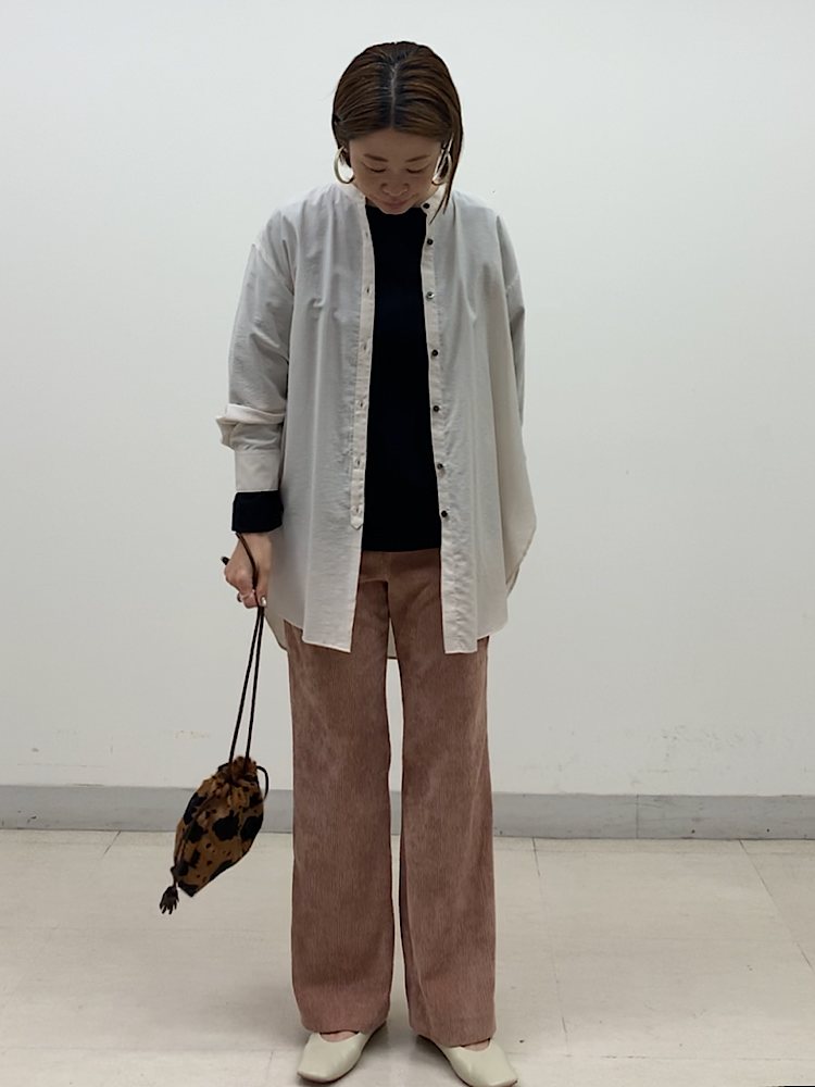 サイズ感:ややゆったり。袖が広めのシルエット。身幅も広いが、横でなく縦に落ちるため、すっきり。