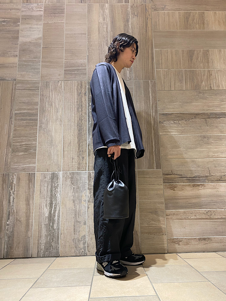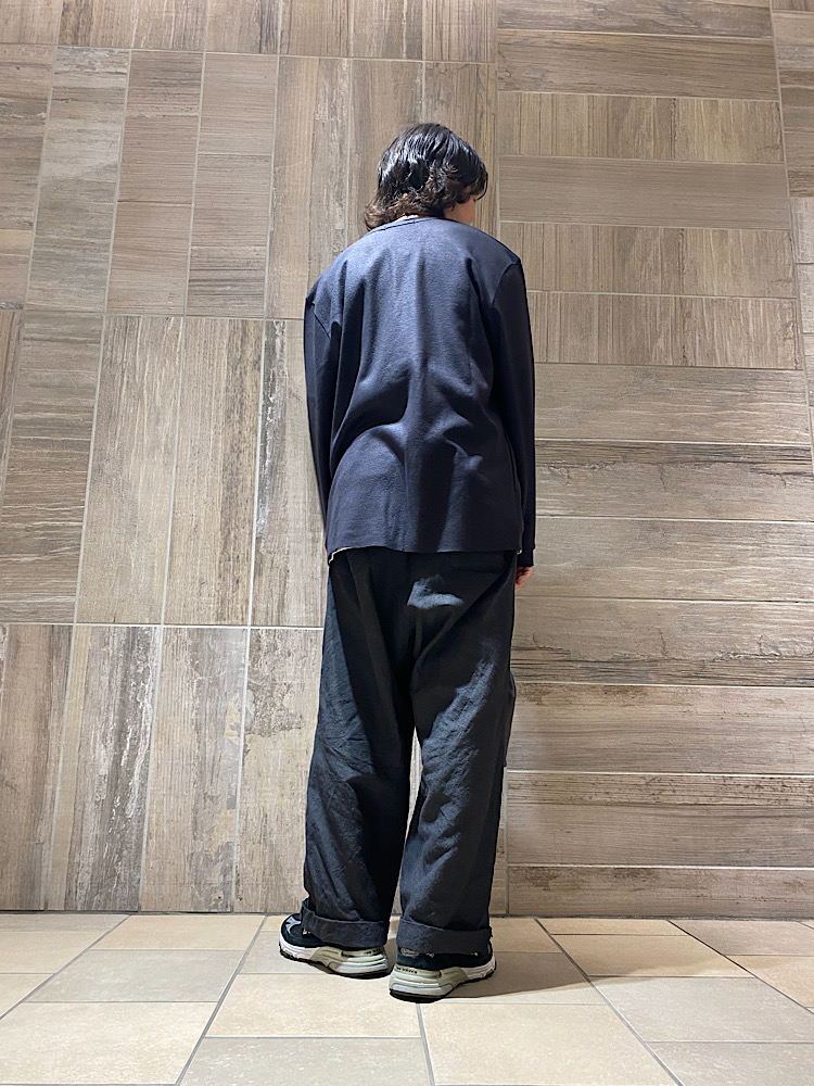 【素材感・着心地】素材はウールです。ウールならではの肌触りで、滑らかな質感です。ややゆとりあるサイジングで、リラックス感ある商品です。