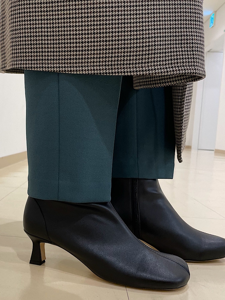 細すぎないテーパード型でタックが入っているので腰回りのラインが出なくて良いです。