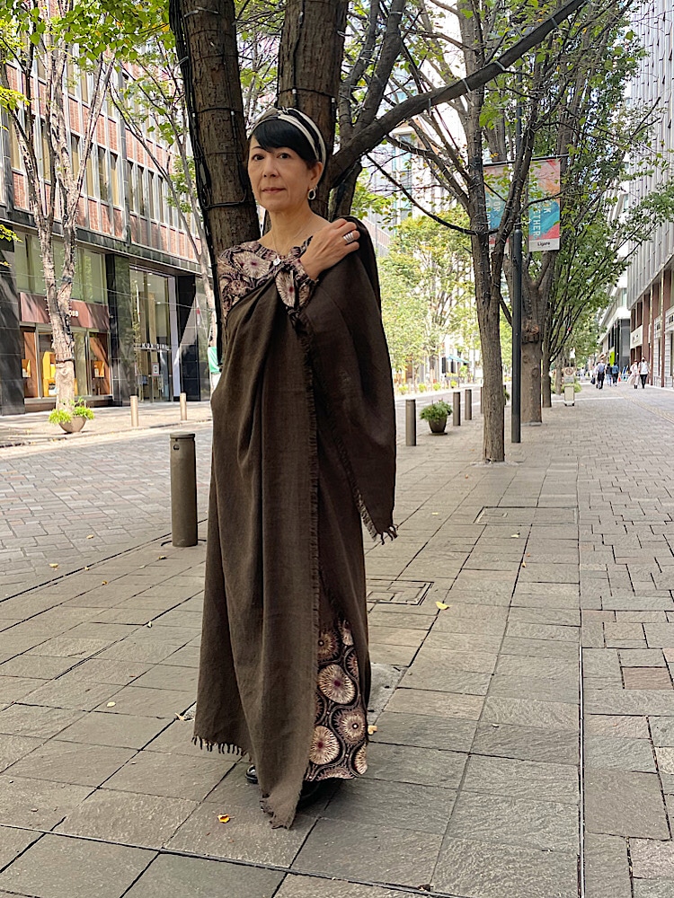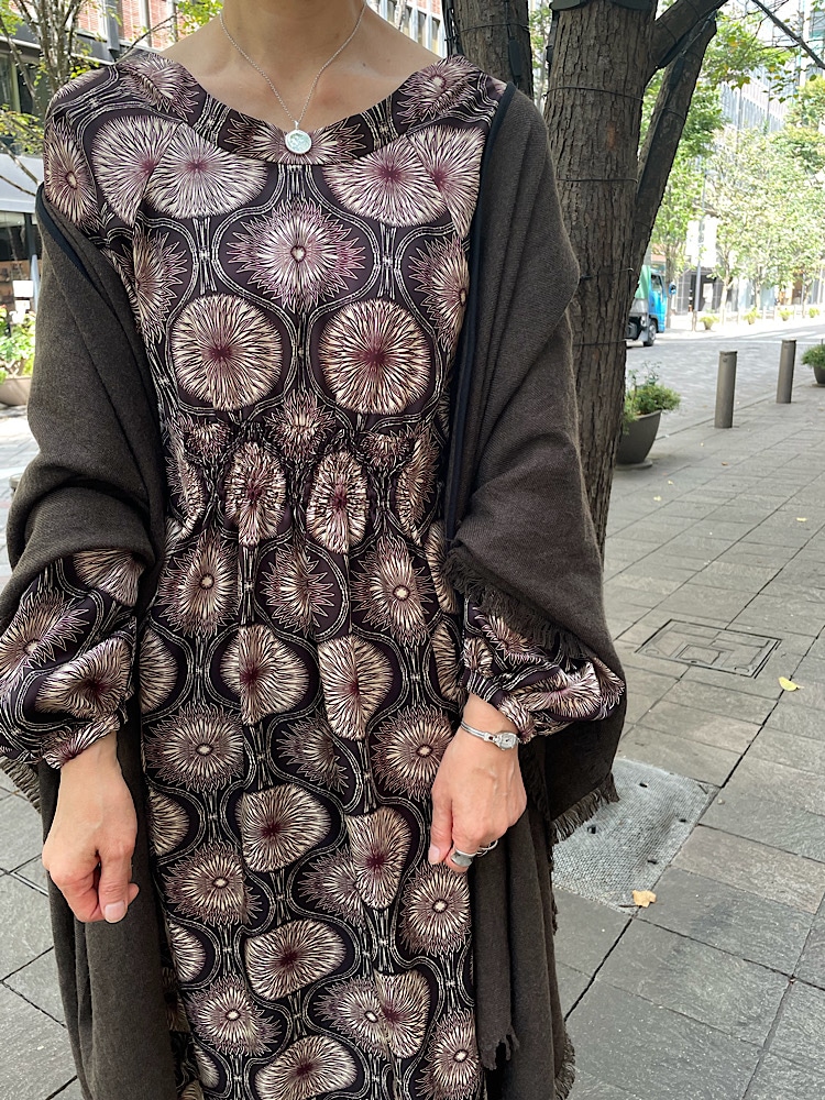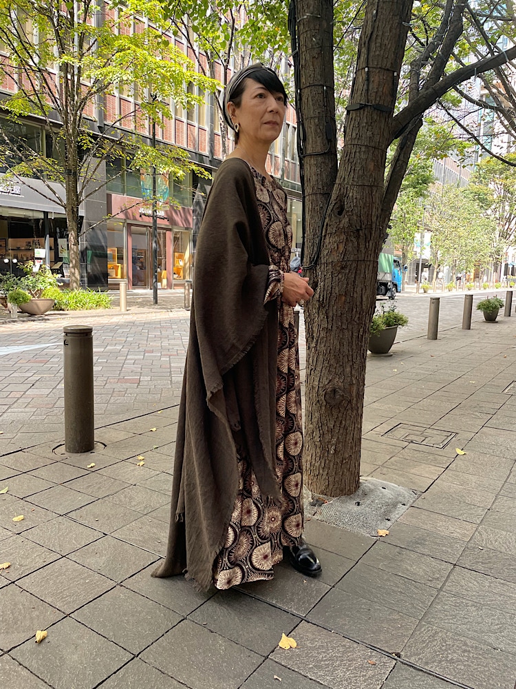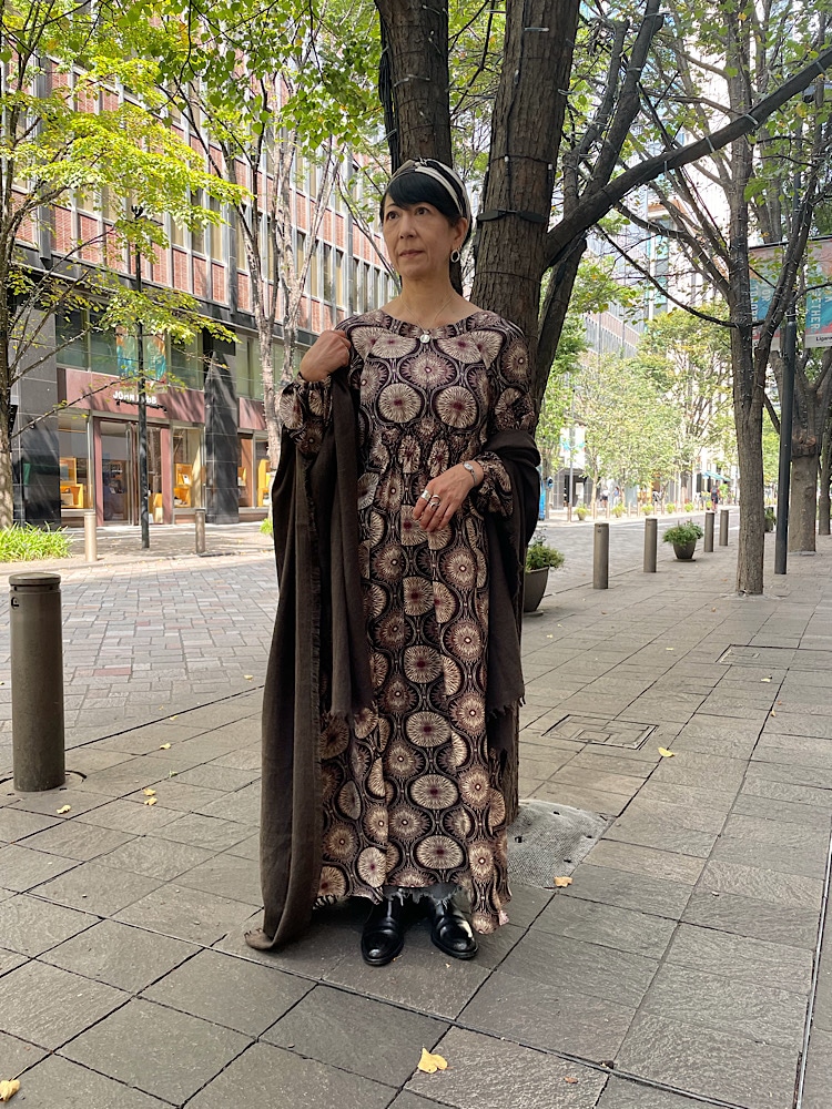 着用アイテム: 大柄プリントドレス:ウール・リネンミックスストール