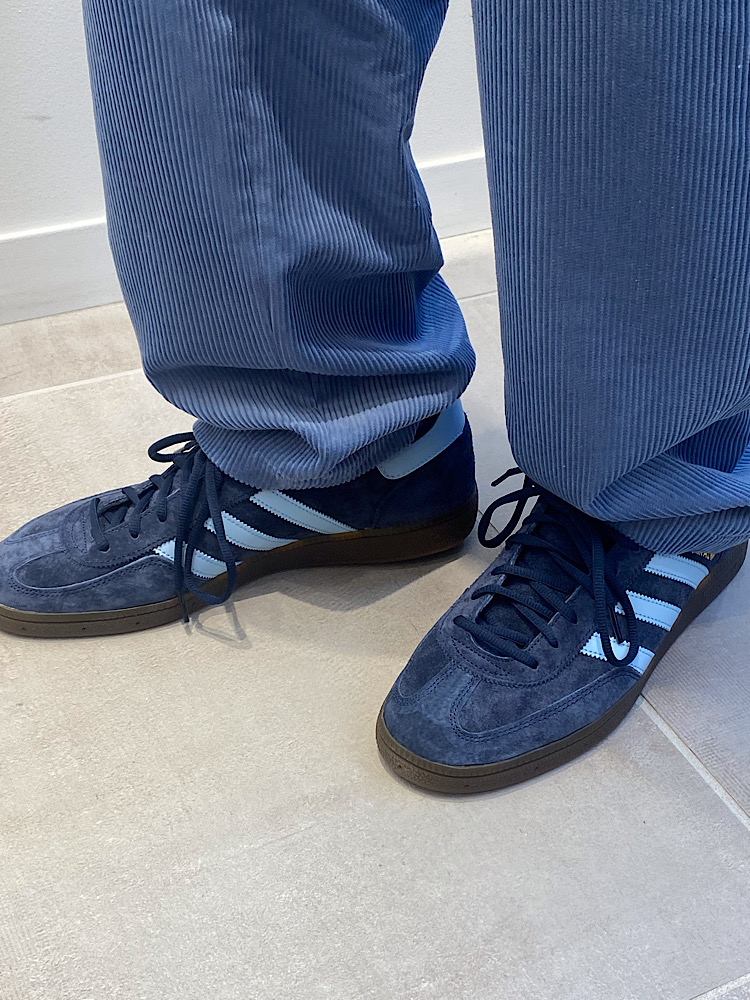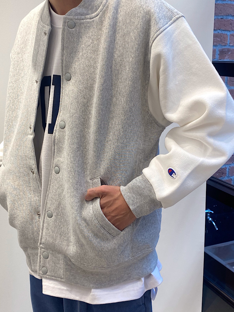 ベーシックなスタジャンコーディネートに水色のコーデュロイパンツを差し色にしたスタイリングです。